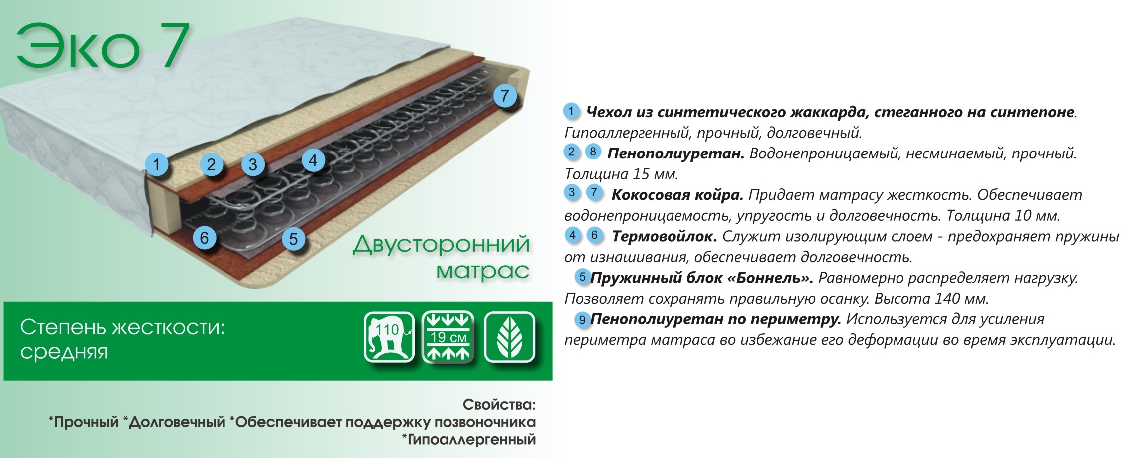 Эко 7 - средняя степень жесткости. Прочный, долговечный, обеспечивает поддержку позвоночника, гипоаллергенный.